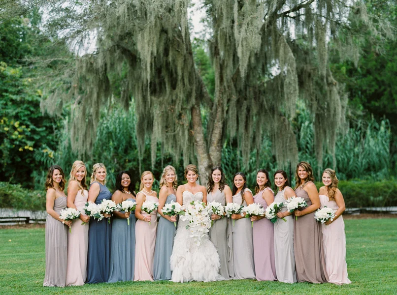 Long, neutral bridesmaids dresses in cool tones at Autumn + Scott's Magnolia Plantation wedding by JoPhoto.