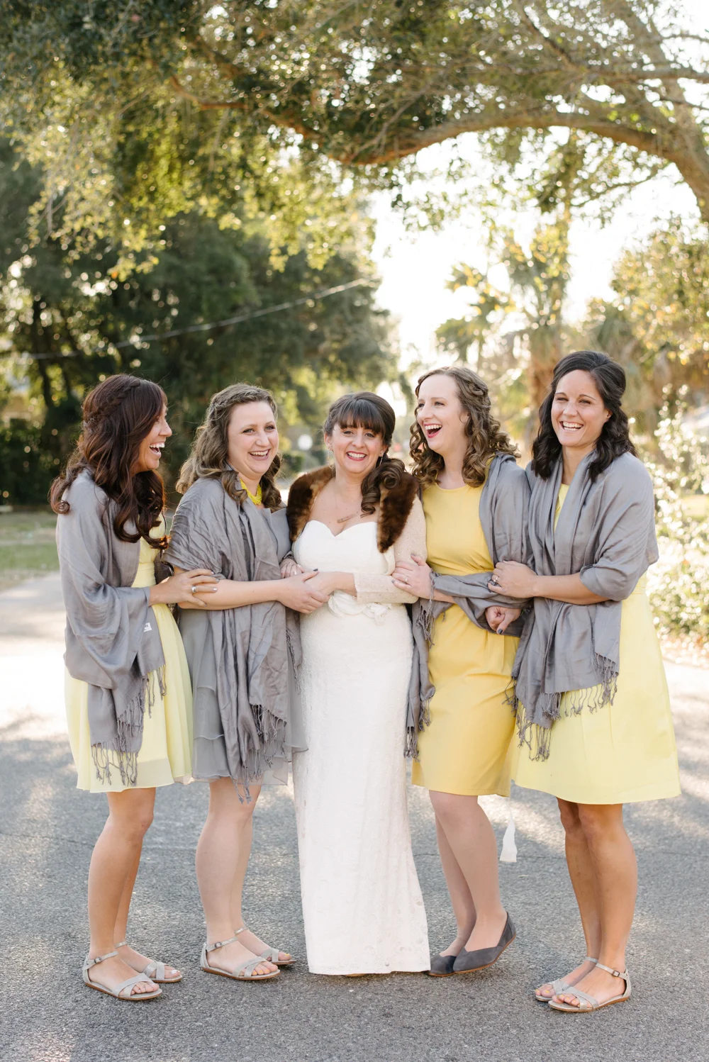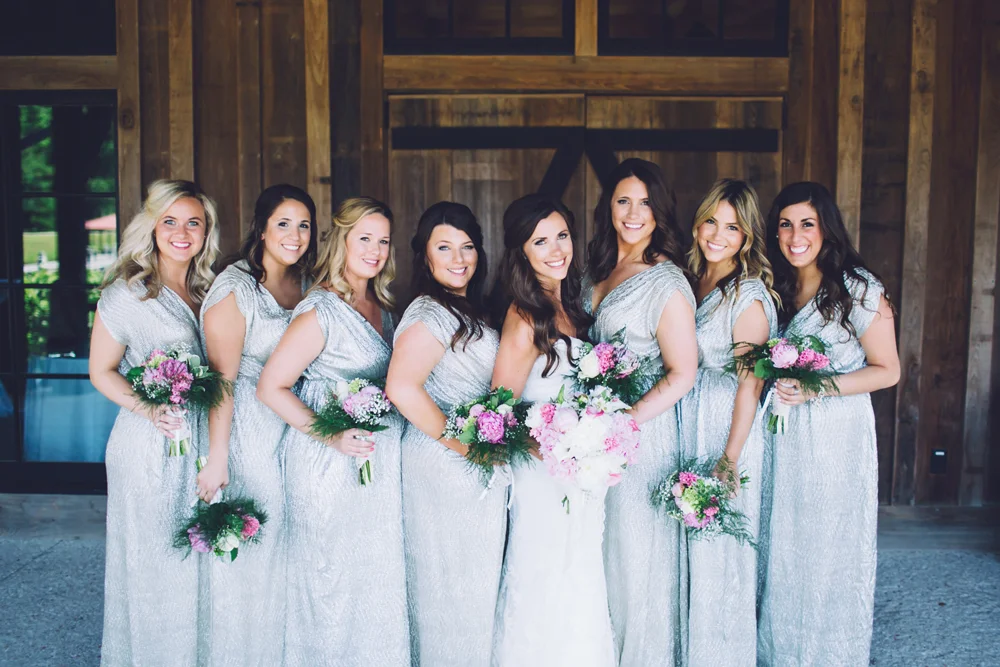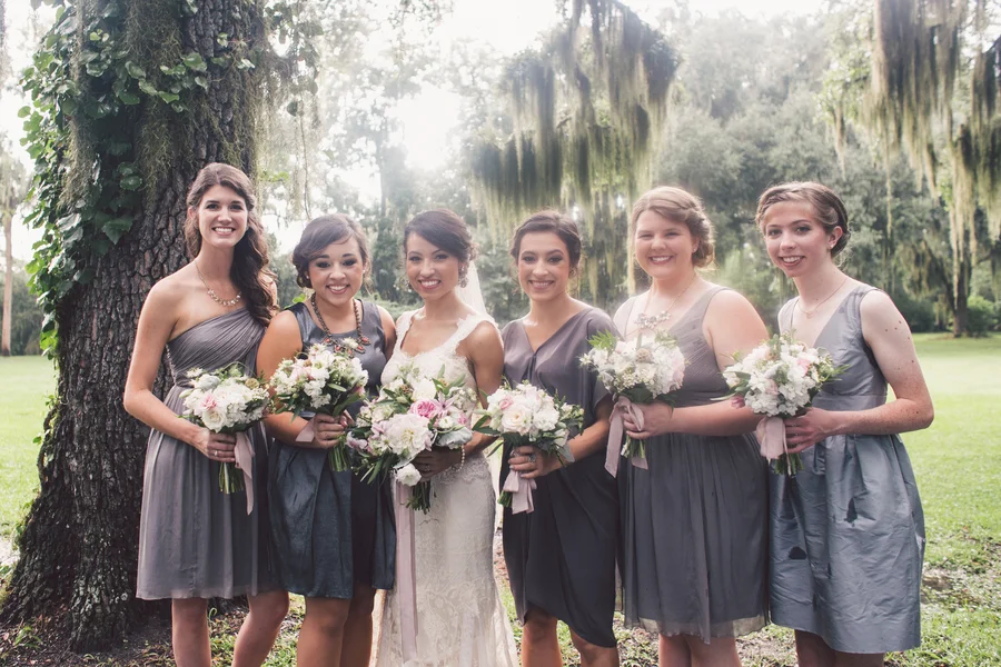 Jennifer's Bridesmaids wore their choice of grey dress for her Savannah wedding at The Olde Pink House.