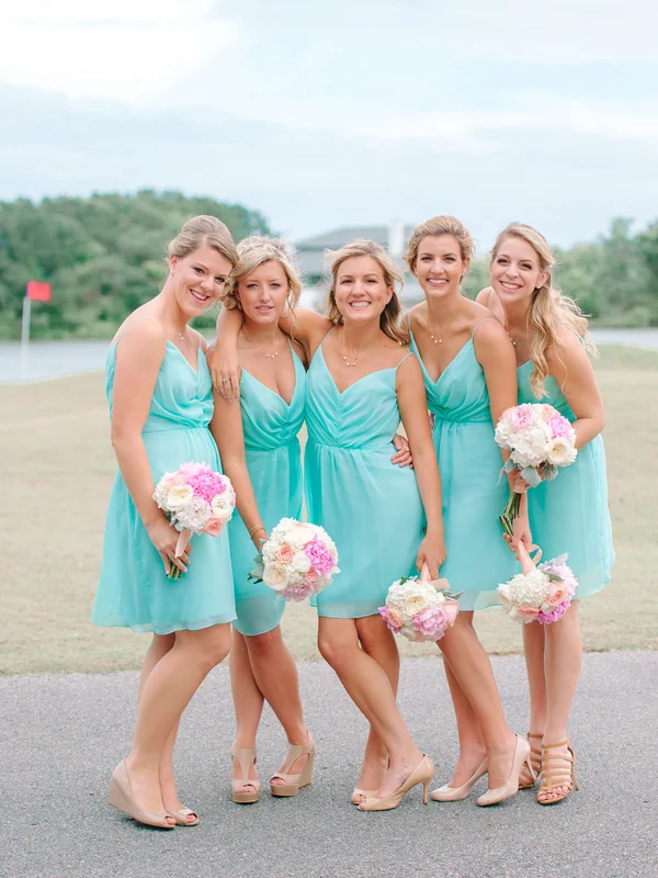 (Left): Aqua Jim Hjelm bridesmaids dresses at Destination DeBordieu Club wedding captured by Pasha Belman Photography. (Right): Cranberry bridesmaids dresses at Hillary + Jackson's Cypress Trees Plantation wedding in Edisto Island, South Carolina by Still Co. Photography.