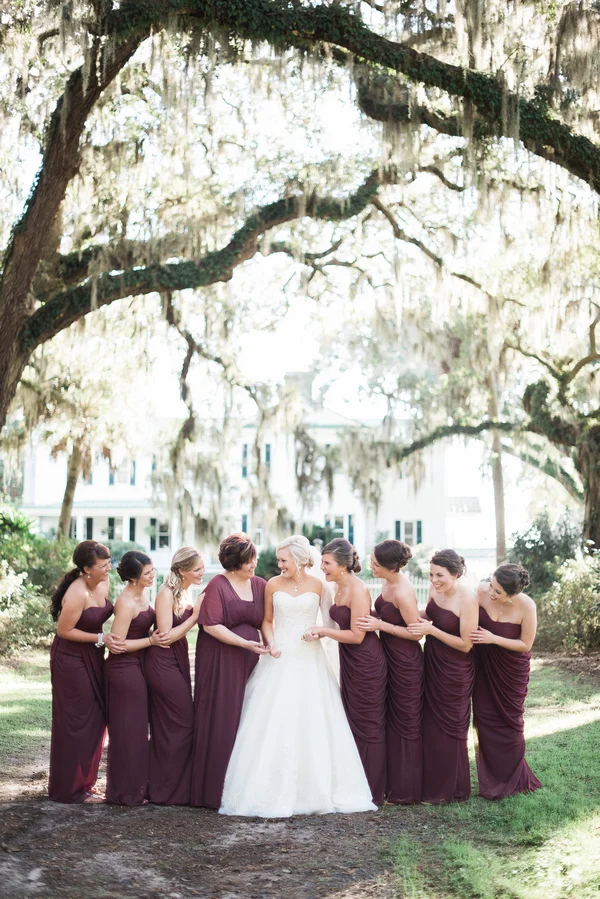 Long, antique rose bridesmaids dresses for Ellen + Dylan's Lowcountry wedding at McLeod Plantation by JoPhoto.