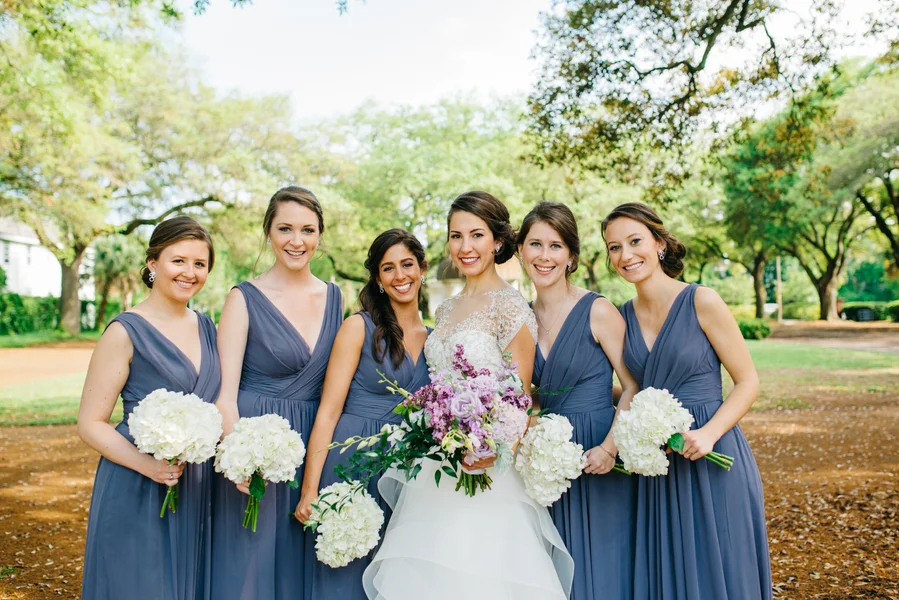 Long Grey V-neck Bridesmaids Dresses at Hibernian Hall wedding in Charleston, SC by Riverland Studios.