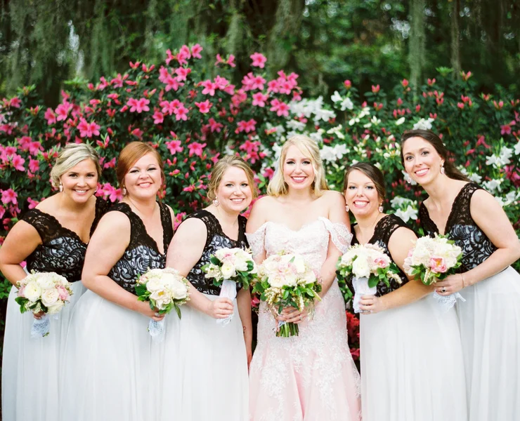Bridesmaids dresses with black lace tops at Magnolia Plantation and Gardens wedding by JoPhoto.