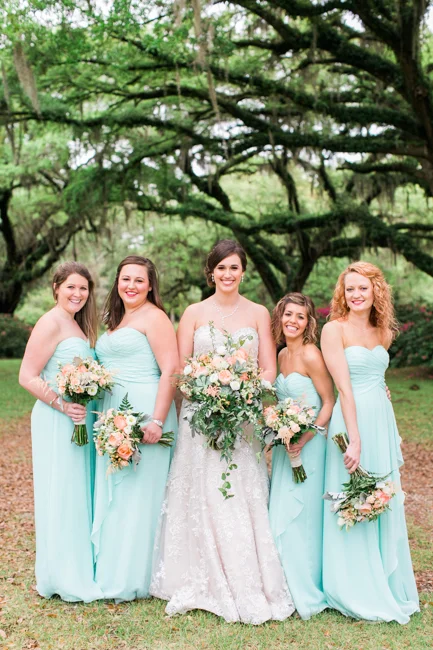 Peach Donna Morgan Bridesmaids at Lowndes Grove Plantation wedding by Dana Cubbage Weddings.