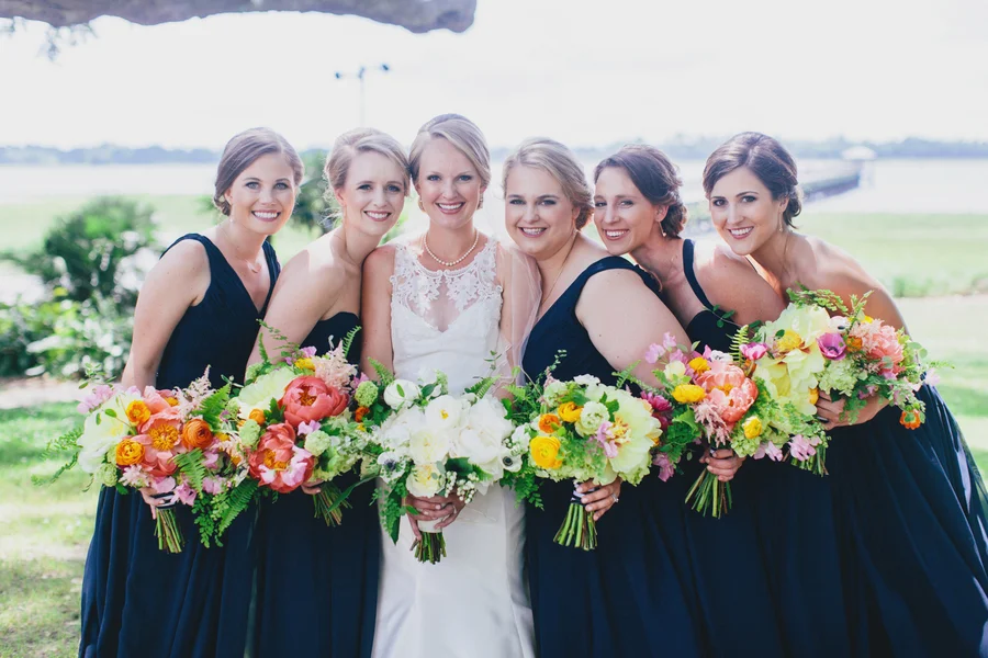 Long navy dresses for Casey + Wiley's Lowndes Grove Plantation wedding by Hyer Images and Sage Innovations.