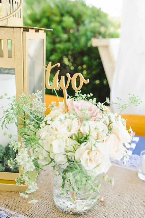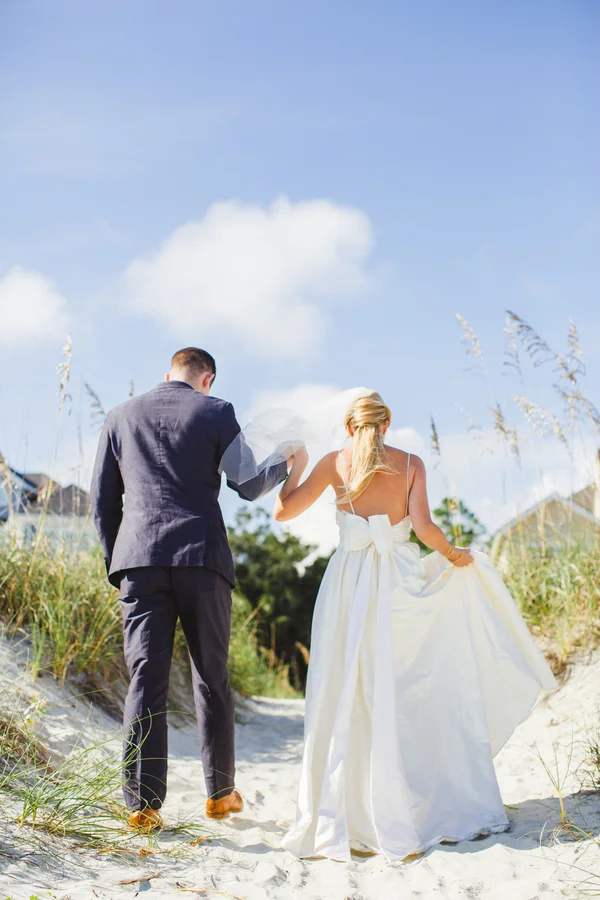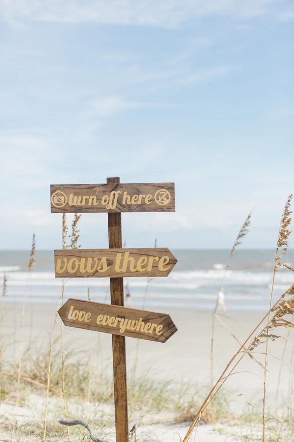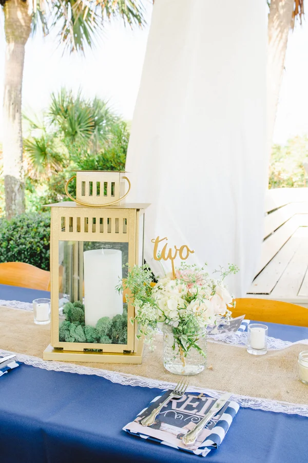 Chicago couple, Kaite + Brian, made the trek to South Carolina for the perfect beach-side destination wedding on Hilton Head Island. Kaite walked down the sandy aisle in a lovely gown she designed herself with a beautiful bow in the back. They said 'I do' in front of their closest friends & family as the waves crashed in the background.. The ceremony was performed a little quicker than expected due to unusually high tides influenced by the Blood Moon! With the help of Weddings with Leah, the couple celebrated with their guests in an open air reception with rustic elements and chic details. The tables were set with burlap and lace runners and topped with soft centerpieces of white and blush blooms in beach wood boxes. Mixed into the decor were gold lanterns and table numbers to complete the look. As the sun began to set, guests enjoyed dinner from Downtown Catering before dancing the night away under the stars. Thanks to Priscilla Thomas Photography for capturing all the details!