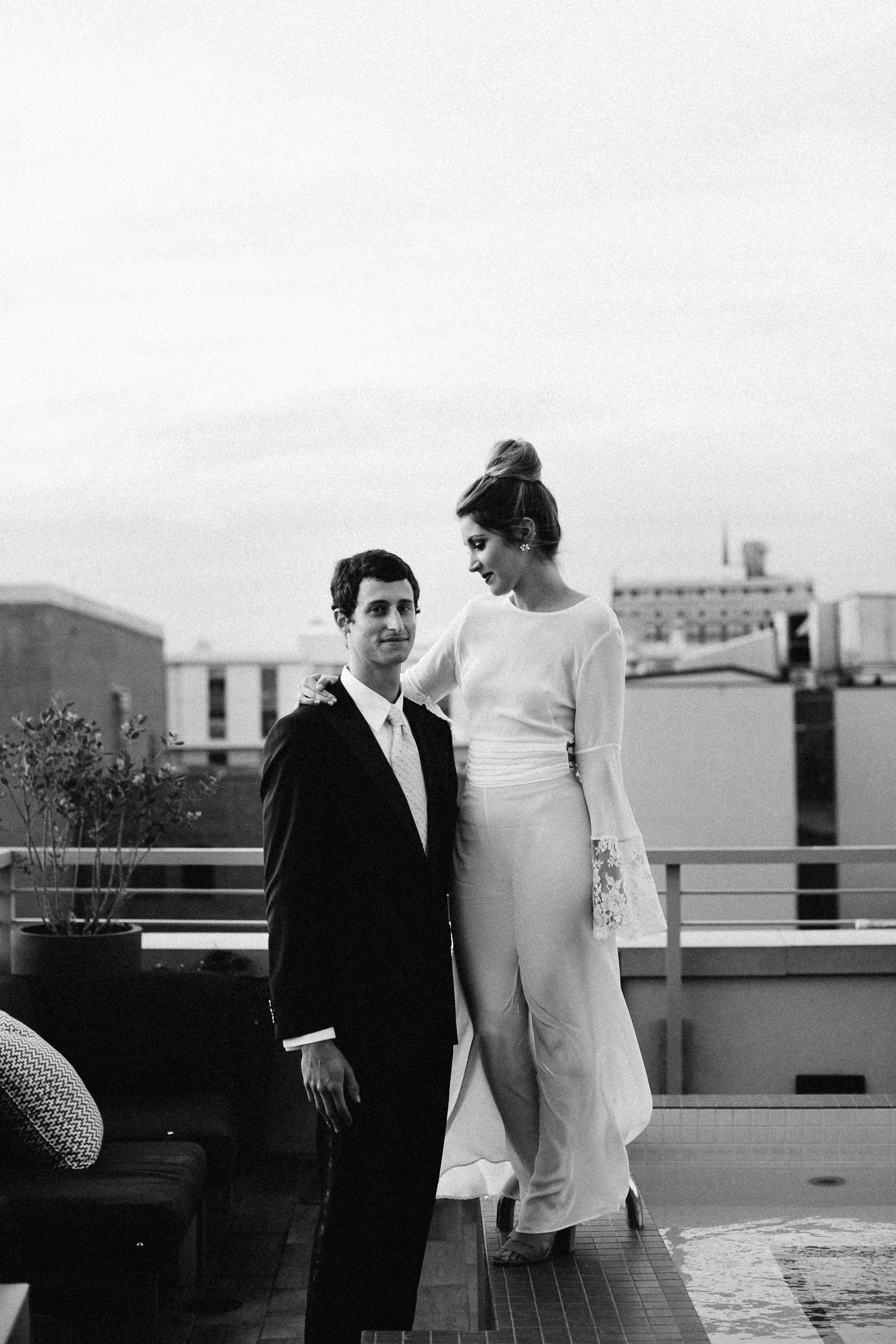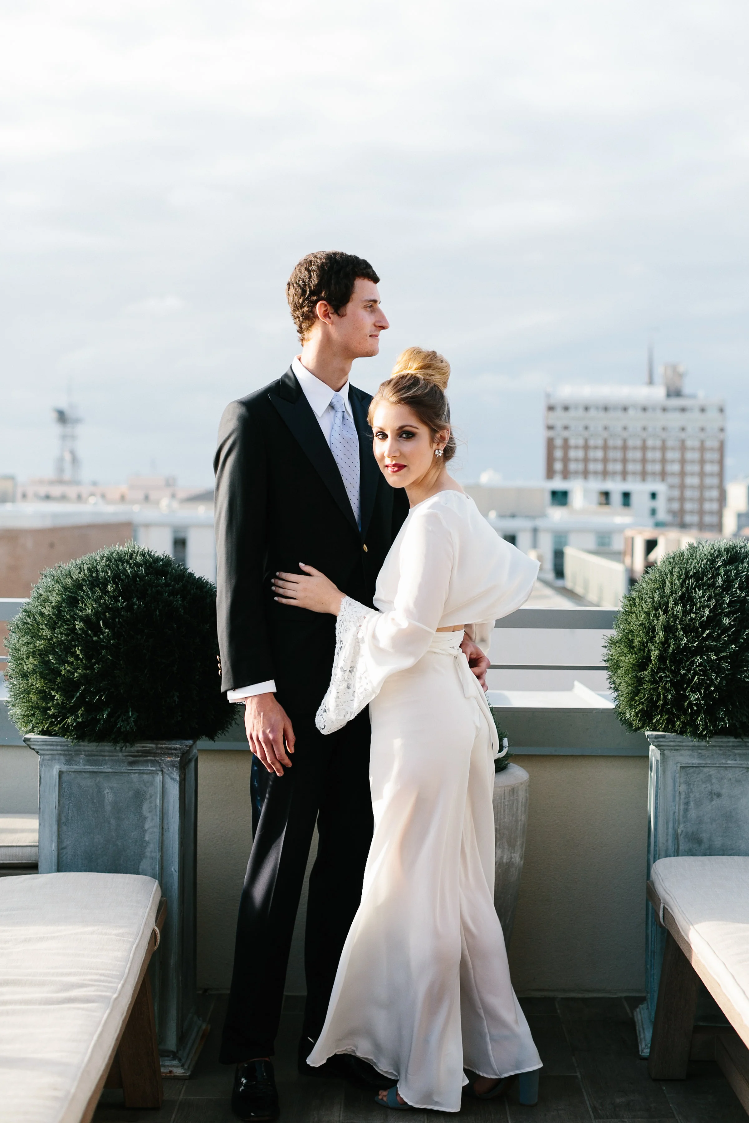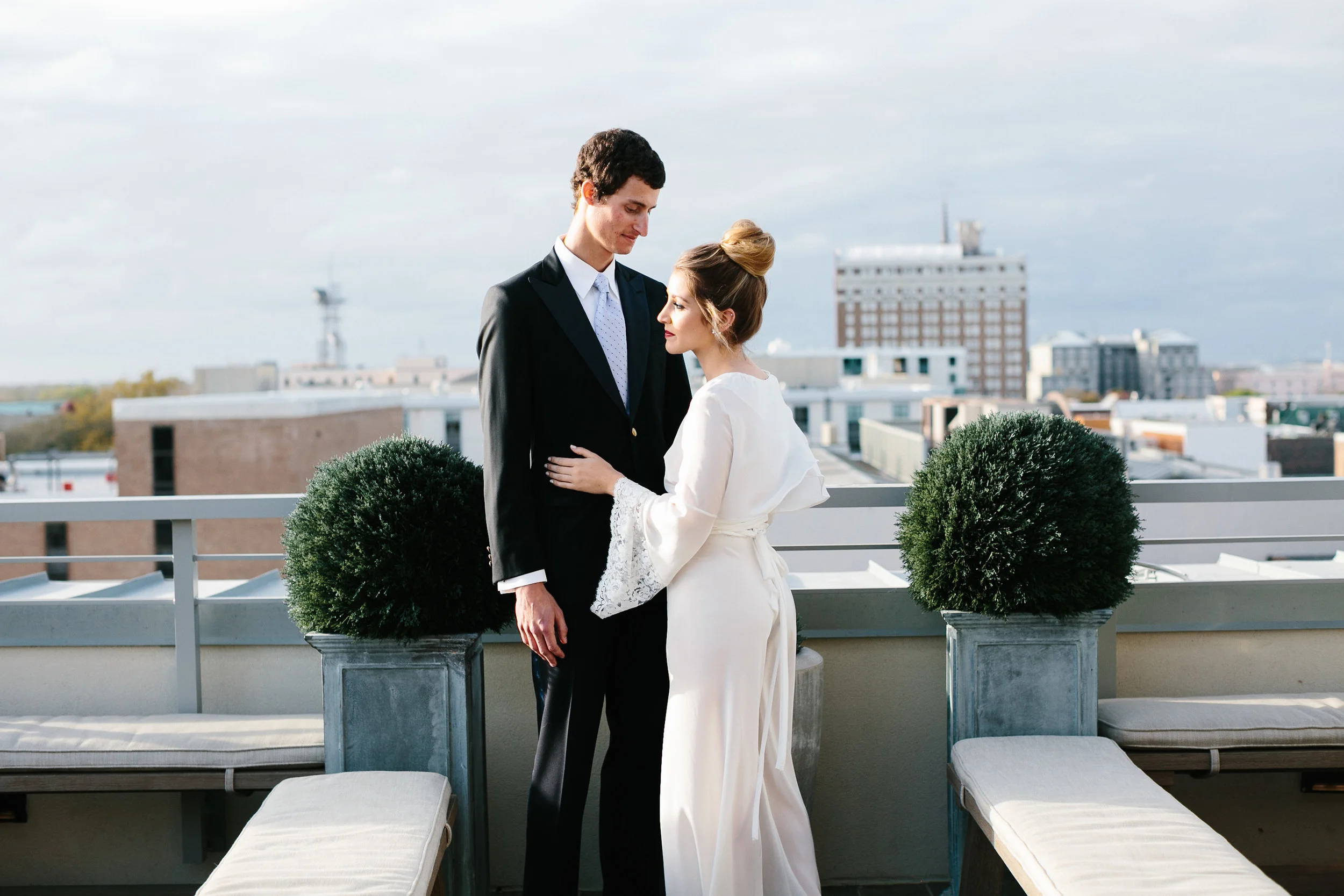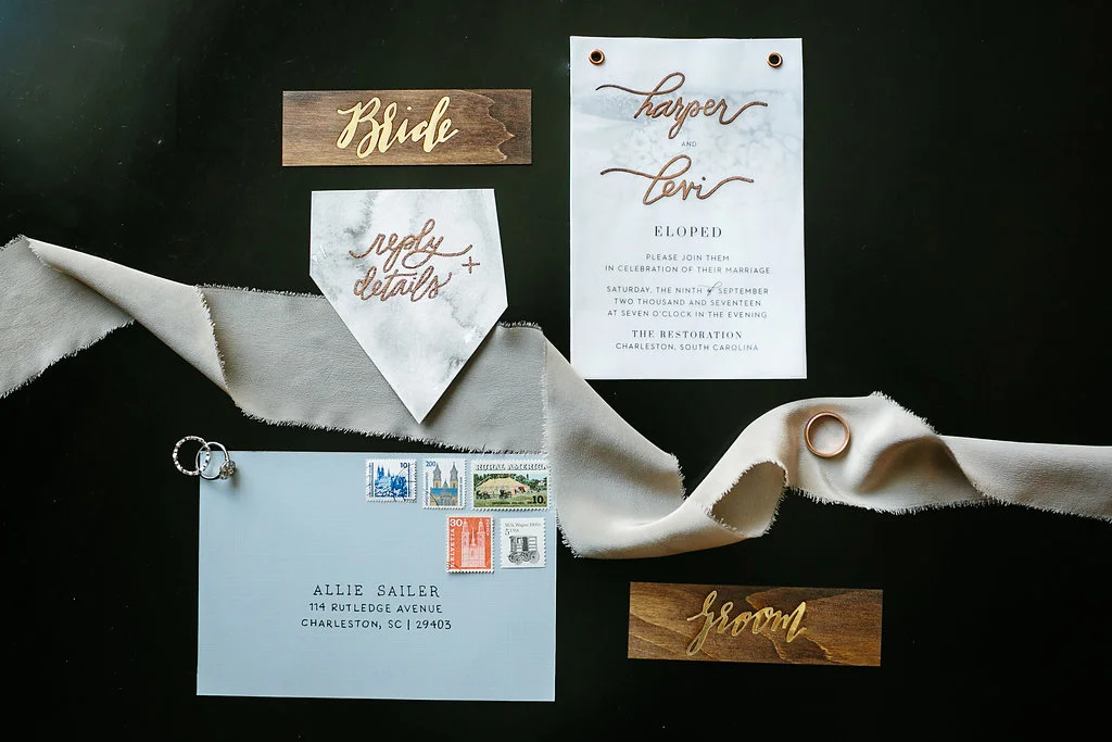 A big guest list and formal wedding aren't everyone's cup of tea and Cayleigh Hopkins of The Petal Report is here to show us how an intimate elopement (party of two!) can deliver the same stylish punch we all love, starting with these sleek paper goods from Britt Bates. The inspiration behind the shoot was to follow two soon-to-be Mr. & Mrs. as they prepped for their meaningful courthouse ceremony in Downtown Charleston, SC. The day started at the luxurious Restoration Hotel where the couple enjoyed their morning coffee before picking out their wedding bands at Croghan's Jewel Box. The stunning bride suited up in a custom Emily Kotarski original with Emma Katzka accessories while the groom wore a K. Cooper Ray tuxedo from M. Dumas & Sons. Dressed to the nines, they toured the streets of the Holy City before exchanging vows at the courthouse. As the sun began to set, the couple enjoyed their first dinner as husband and wife while soaking in beautiful rooftop views. Thanks to Elizabeth Ervin for documenting all the details