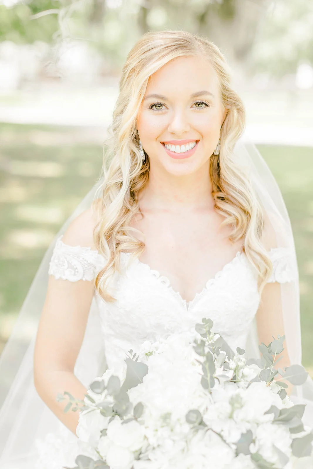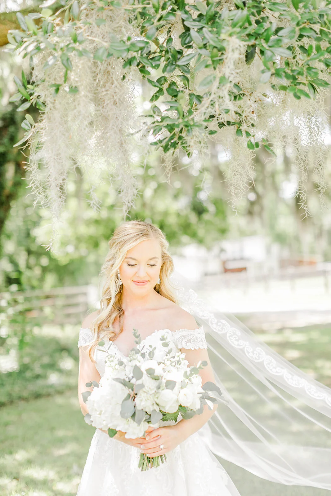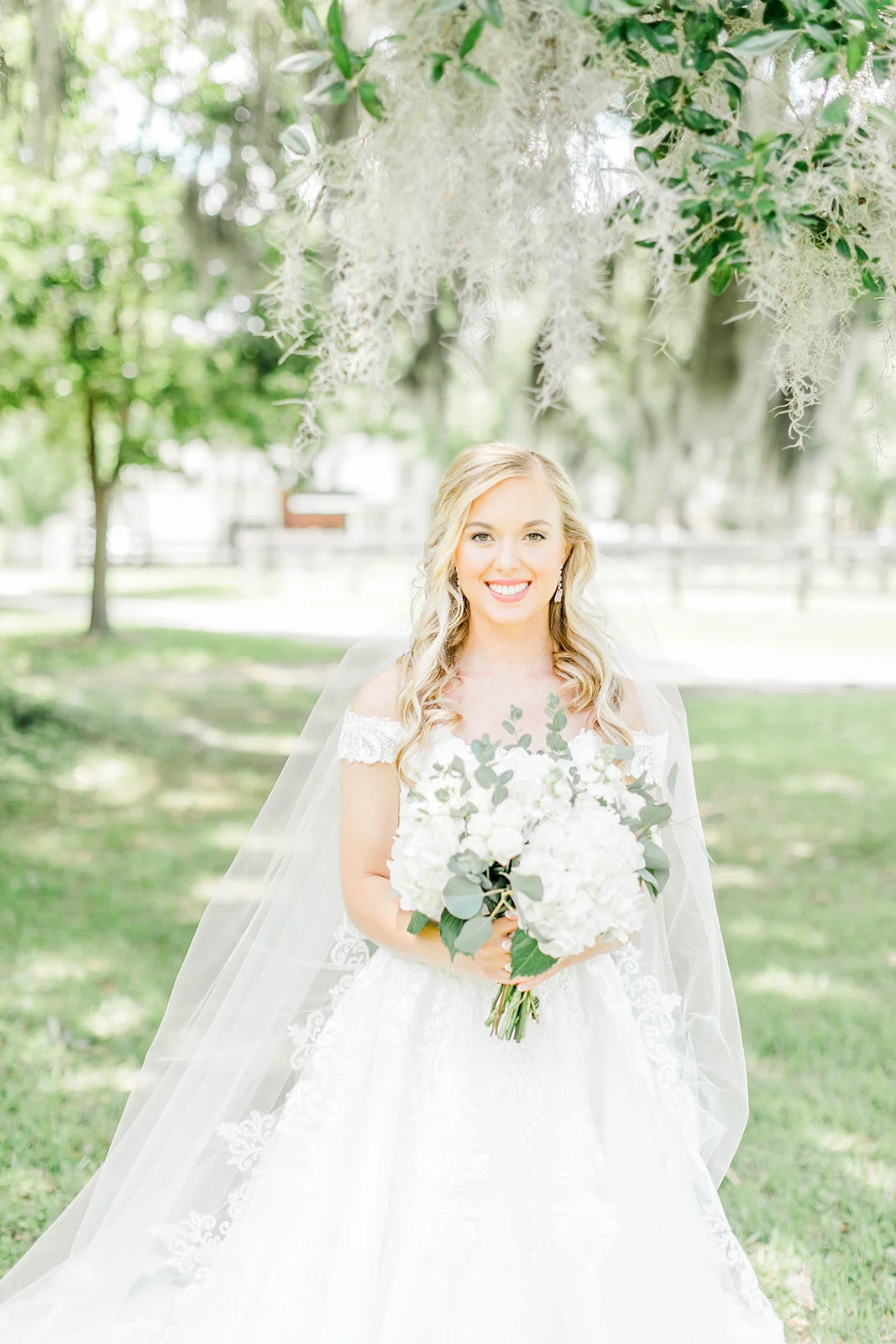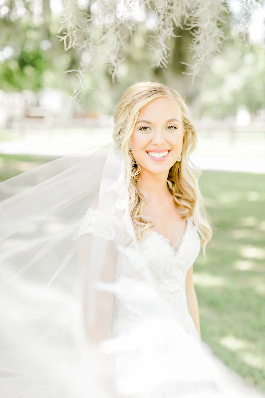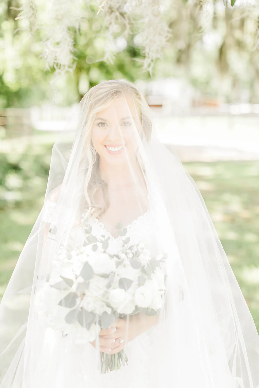Venue: Pepper Plantation ll Photographer: Emily Veinberg Photography ll Gown & Veil: Bridals by Jodi ll Hair & Makeup: Lashes and Lace ll Florist: Charleston Blooms
