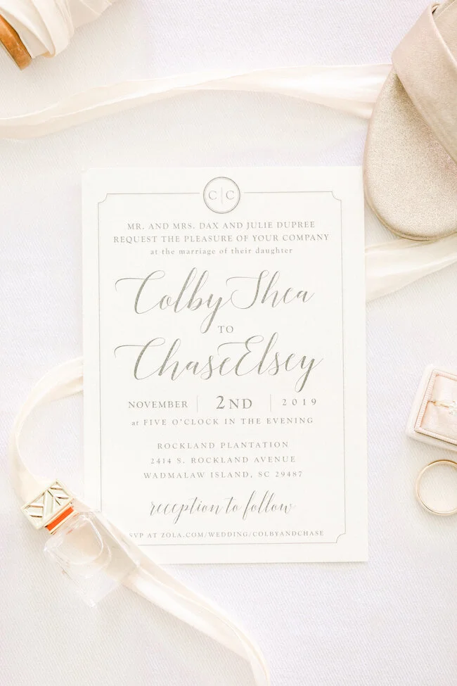 Planning & Design: Abby Broughton for Chancey Charm ll Photography: Haley Jane Photography ll Venue: Family Home on Wadmalaw Island ll Hair + Makeup: The Parlour Charleston ll Videography: Siegel Films ll Rentals + Linens: Ruth's House ll Catering: Crazy Dutchman Catering ll Bride's Attire: Verita Bridal Charleston ll Groom's Attire: Jos. A. Bank ll Cakes: Bride's Aunt ll Florals: Harris Teeter on East Bay Street ll Paper Goods: Family Friend ll Vintage Car: Family Friend ll Wedding Submission Services: Published + Pretty