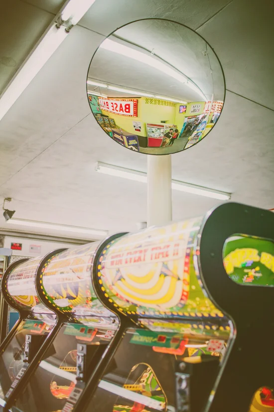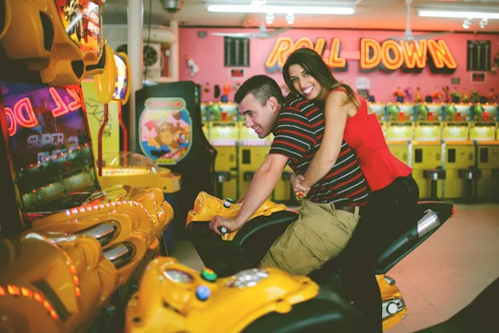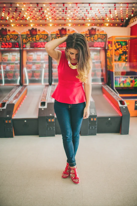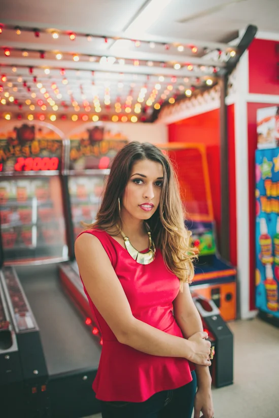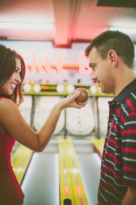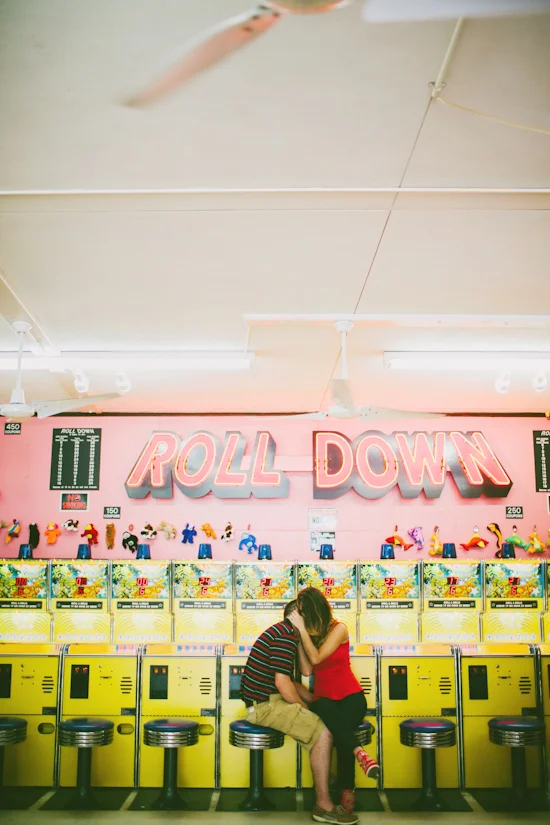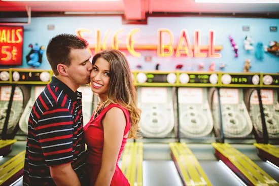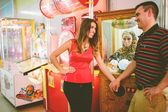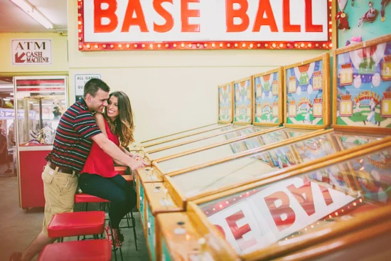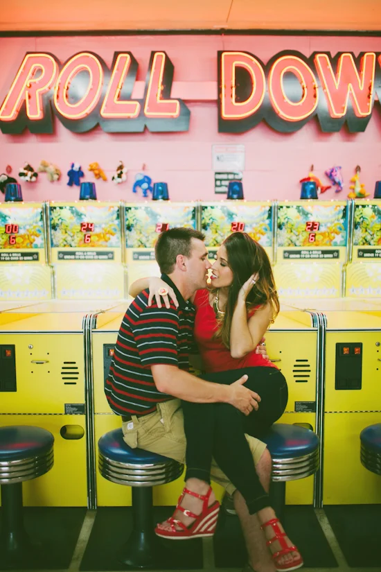 I about died when I first saw Amanda + Jonathan's arcade engagement session in Myrtle Beach by Angela Cox Photography. The minute I saw first saw this couple, I shot Angela an email and asked (Okay, maybe I begged and pleaded!) if I could share it on A Lowcountry Wedding because I just KNEW ya'll would love it! The afternoon got started under the neon lights of the arcade where they tried their hand at skeeball and even chatted it up with the Lucky Lady! Amanda is just stunning and along with her beautiful smile, she dazzled in a red top, jeans and some killer shoes. Then, they kicked it over to the beach for some casual pictures with their toes in the sand...Don't you just love it :)