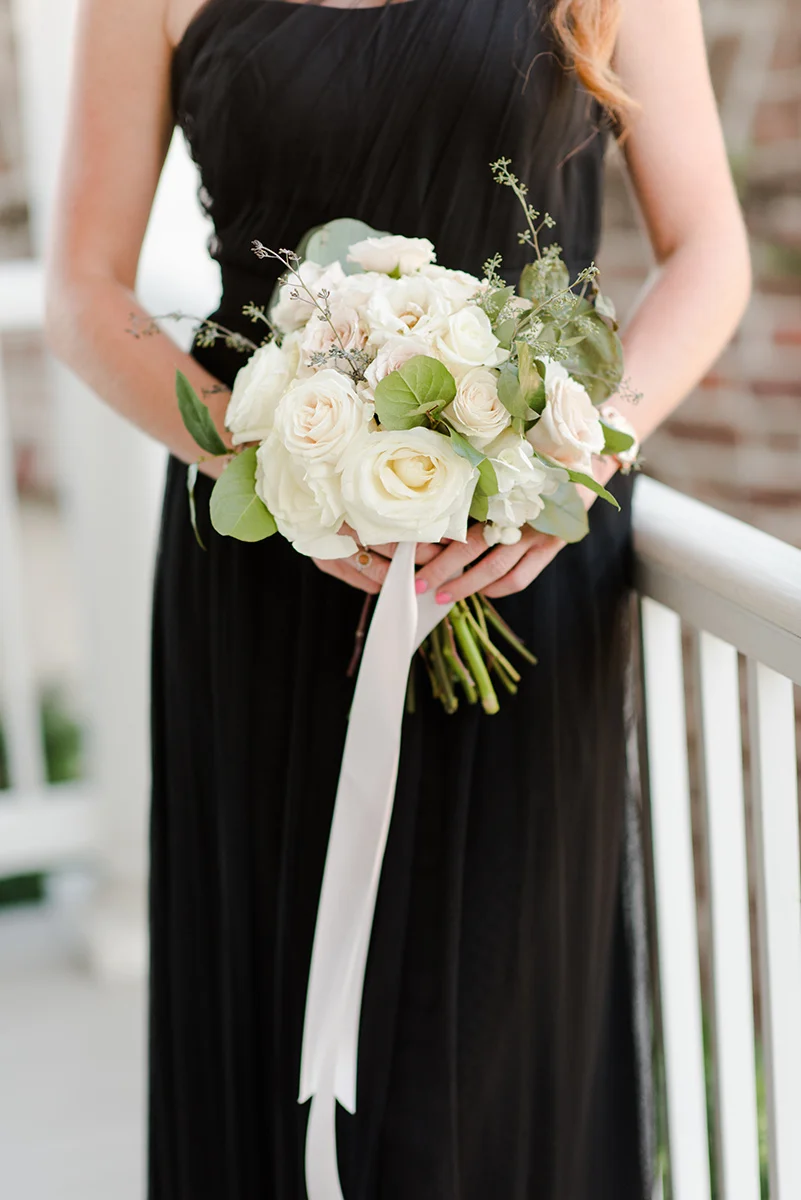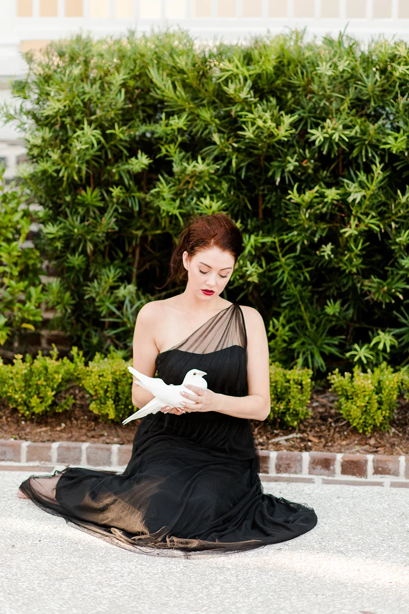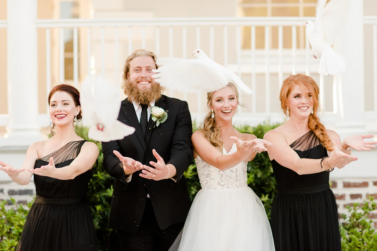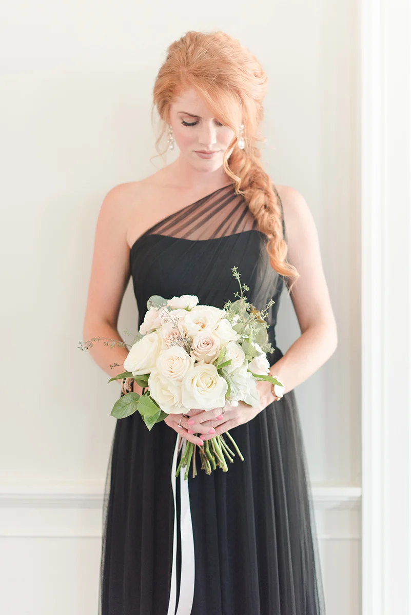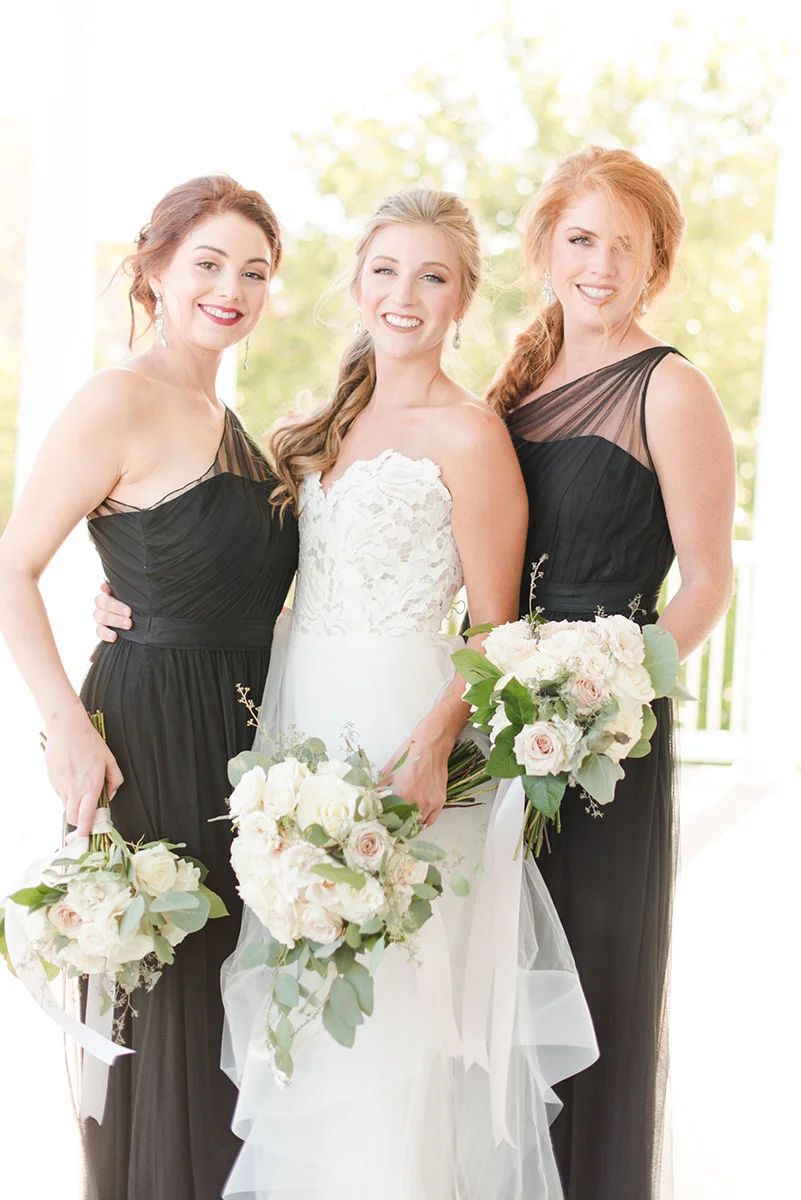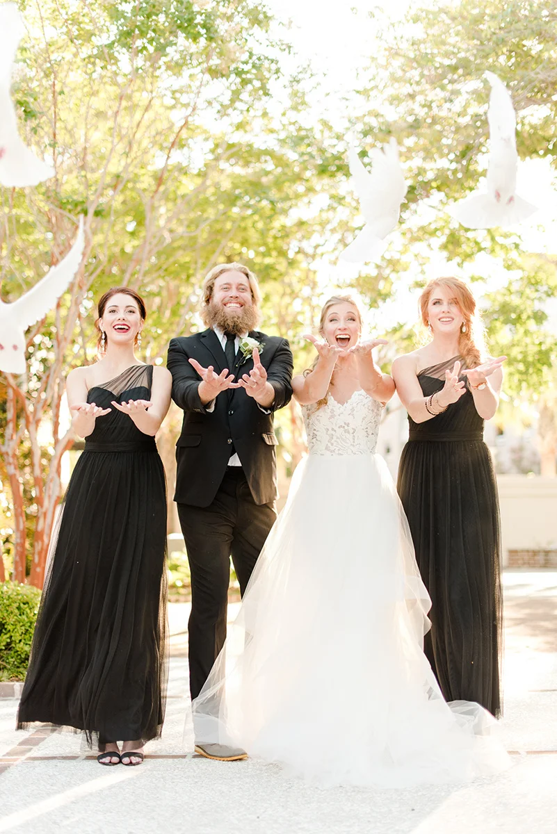 If you're in the mood for a dose of elegance, you're really going to love this black tie wedding inspiration at The Gadsden House from Candi Leonard Photography and crew. Candi teamed up with Heather Benge Events (who you may remember from this dose of colorful wedding inspiration at Magnolia Plantation) to create a Summer afternoon with a black and white color palette. To complement the classic color scheme, soft pinks, greenery and metallic touches were added for a modern twist. The sweet bride (one of our personal favorites, Mrs. Natalie Taylor) stunned in a Hayley Paige gown from Bridals by Jodi while her bridesmaids (the lovely Taryn Berger and Molly Rhyne dazzled in one-shouldered black dresses. Larger Than Life Events lined the long estate table with a greenery runner accented by white blooms and tall centerpieces overflowing with fragrant eucalyptus were the finishing touch. But our absolutely favorite part - the magical white dove release from Holy City Doves - the perfect punctuation mark on this black tie wedding inspiration at The Gadsden House!