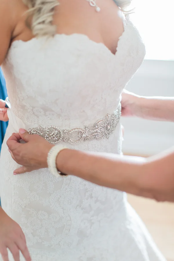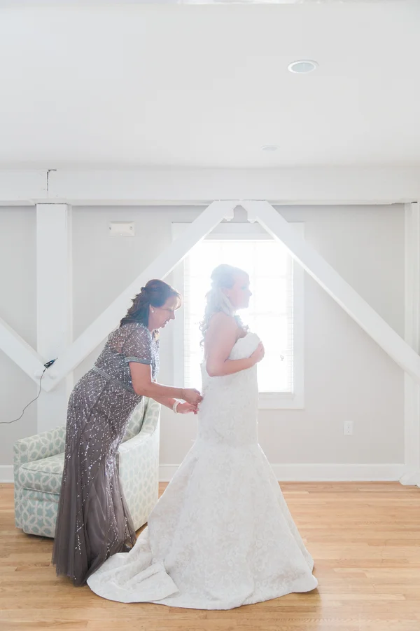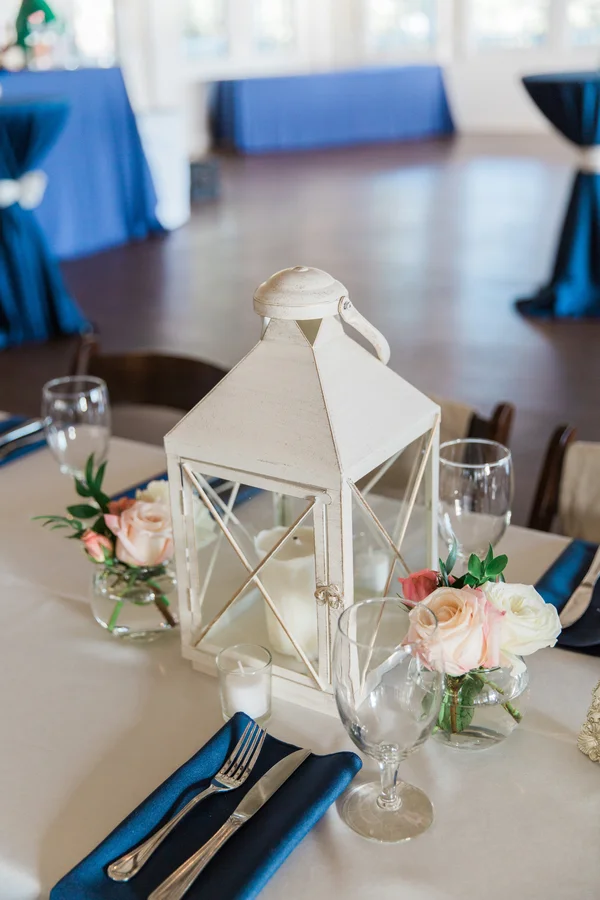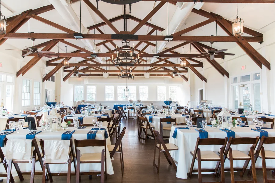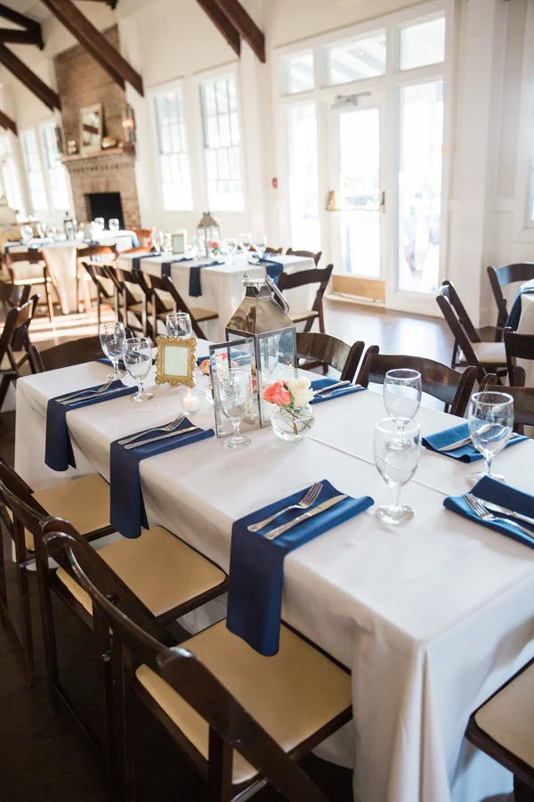 Danielle & Tim tied the knot in a lovely Navy wedding at Alhambra Hall but it wasn't without some serious weather-related stress. The couple married less than a week after Hurricane Matthew left its mark on the Lowcountry's coast and Charleston, in particular to quite the beating. But once the water receded and the sun began to shine, Danielle & Tim were excited to find their wedding venue, Alhamabra Hall in Mount Pleasant, South Carolina, managed to escape with little damage, so they were full steam ahead with their original plans. The couple, who met at a restaurant where Danielle worked, had always had a soft spot in their heart for the Holy City and knew it was the perfect spot for their Fall wedding. Their ceremony took place outdoors, overlooking the Charleston Harbor, just as the sun began to set. Inside, Chauncey of Bouquets and Bowties Charleston handled the planning and design and created a navy wedding reception with crisp white details and peach accents. Thanks to Ava Moore Photography for capturing their Alhambra Hall wedding.