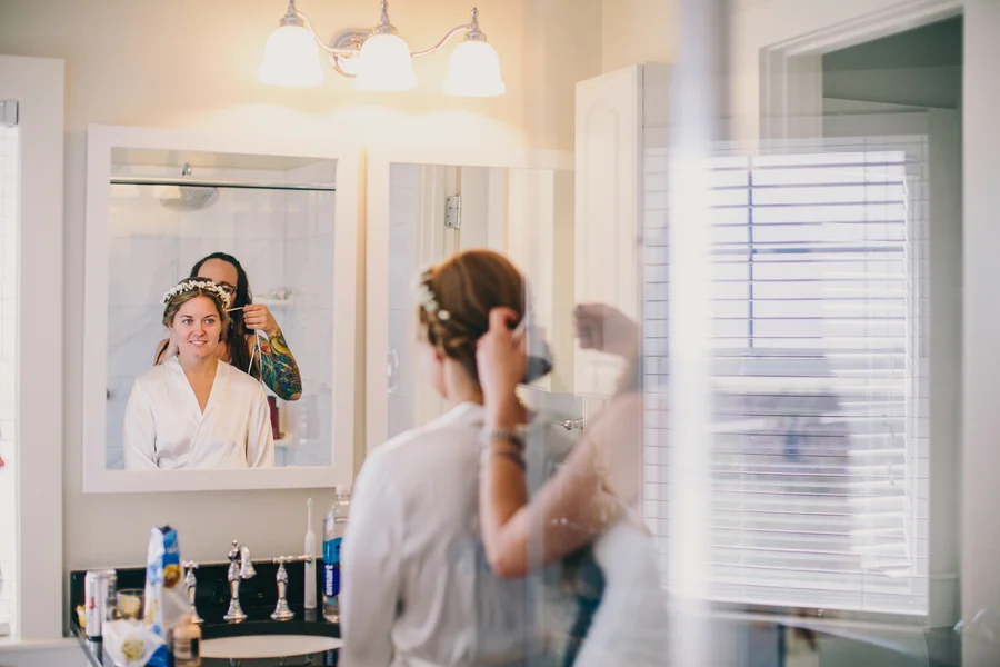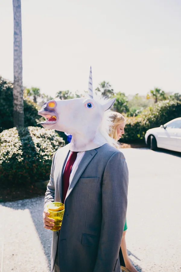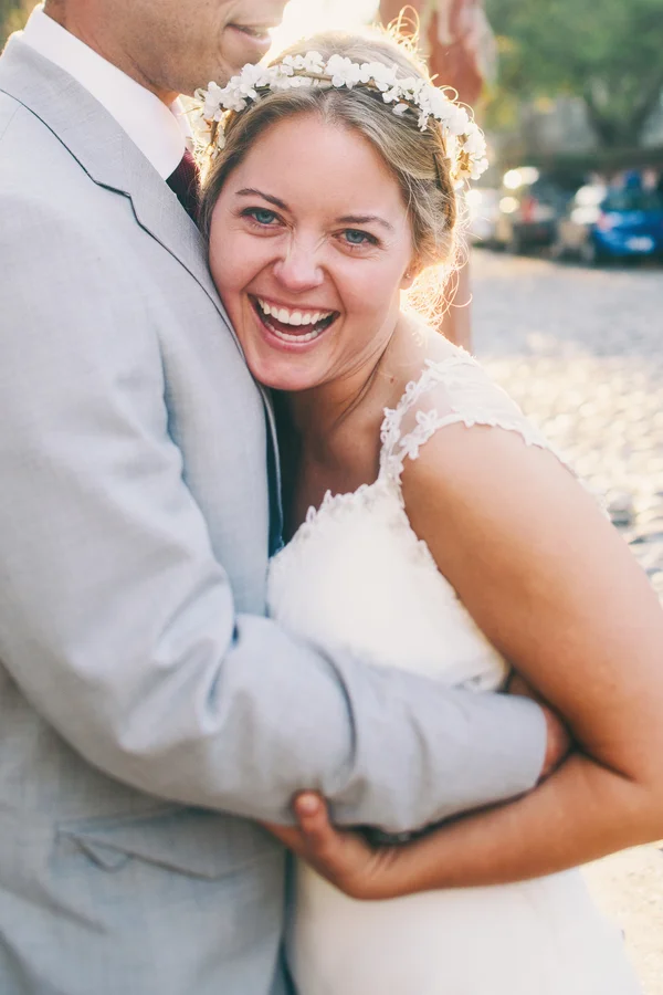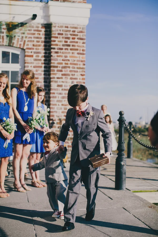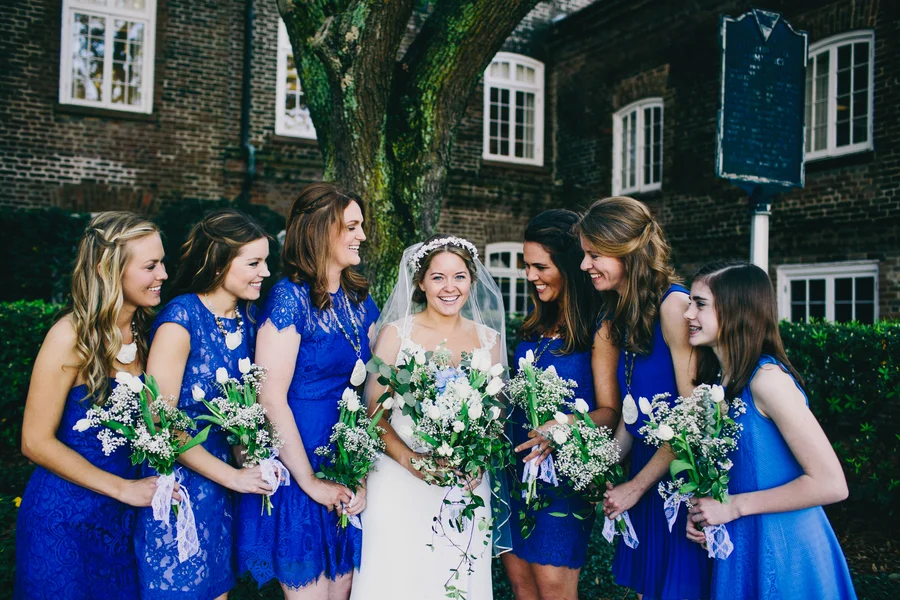 Oh, Nancy! We are so in love with today's bride's amazing gown's sheer back and your beautiful floral crown. But all of that pretty is just the start of our obsession with Nancy + Pete's Charleston wedding at The Historic Rice Mill Building planned by Ashley Nicole Events. The sweet couple met up for a first look before jumping in an Absolutely Charleston trolley and making their way to The Rice Mill Building for their cheerful outdoor ceremony. The newlyweds and their bridal party (with their bridesmaids dressed in blue), spent some time by the water to snap a few portraits with Hyer Images...and a unicorn head! Inside, Loluma designed a chic evening of navy, gold and romantic candlelight as guests enjoyed Lowcountry cuisine from Good Food Catering and a sweet creation from Ashley Bakery. With a packed dance floor, we can only guess that this Rice Mill Wedding was just as fun as it was gorgeous!