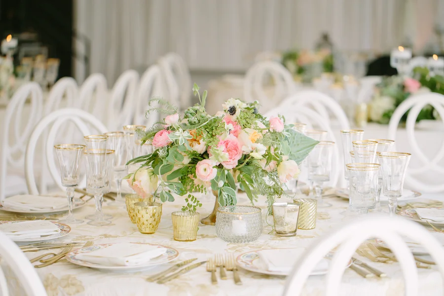 We're turning up the glam this morning with a romantic Summer wedding at Magnolia Plantation from Cibi Events and Riverland Studios. The couple, Rose & Joey, knew each other in high school but it wasn't until after college that the two became something special. For their big June affair, Rose (who you may remember from her stunning William Aiken House bridals) donned an elegant gown with beaded straps and a ruffled skirt while her bridesmaids wore a deep shade of blue. The ceremony took place on Magnolia Plantation's lawn where crisp white chairs, pink parasols and sweetgrass fans greeted guests. They exchanged vows under a beautifully adorned arbor full of white hydrangeas, peach garden roses and pink roses from the team at Branch Design Studio. The reception was held in an enclosed tent behind the veranda and it was nothing short of breathtaking. Draped in floor-to-ceiling white fabric and adorned chandeliers, guests were treated to a magical Lowcountry evening. Vintage china was placed at each seat along with gold-rimmed glassware, flatware and white chairs while lush, textured centerpieces pulled the entire design together. Cru Catering served up a mouthwatering menu of shrimp & grits and beef filet which was followed by a beautiful cake from Cakes by Kasarda. The evening concluded on the dance floor where The Mighty Kicks lead the way!