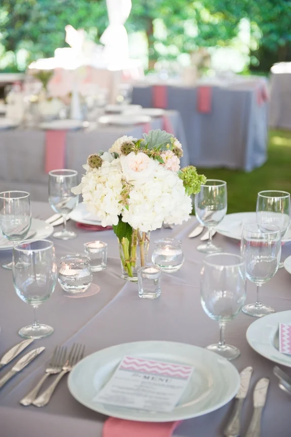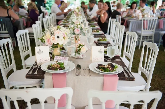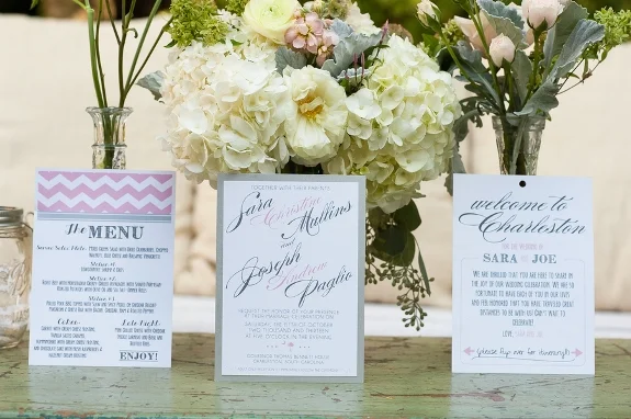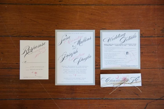 Y'all, I'm about to divvy up a serious dose of Charleston wedding loveliness straight from the lens of the wonderful Jennings King Photography. Sara + Joe's Thomas Bennett House wedding was the pink + grey brainchild of Sara York Grimshaw + The Burlap Elephant and we're quite certain you'll be pinning every last image. The duo created a romantic evening on the lawn where guests dined on Lowcountry cuisine from Newton Farms before bustin' a move on the dance floor! We love how Sara incorporated meaningful details throughout her October wedding day including the locket worn by her mother, grandmother and great-grandmother which was wrapped around her beautiful bouquet and a swatch of her grandmother's wedding dress was sewn into the hem of her gown. Her sister also played a part, as she designed all her lovely Charleston wedding stationery!