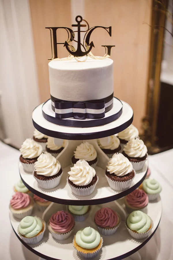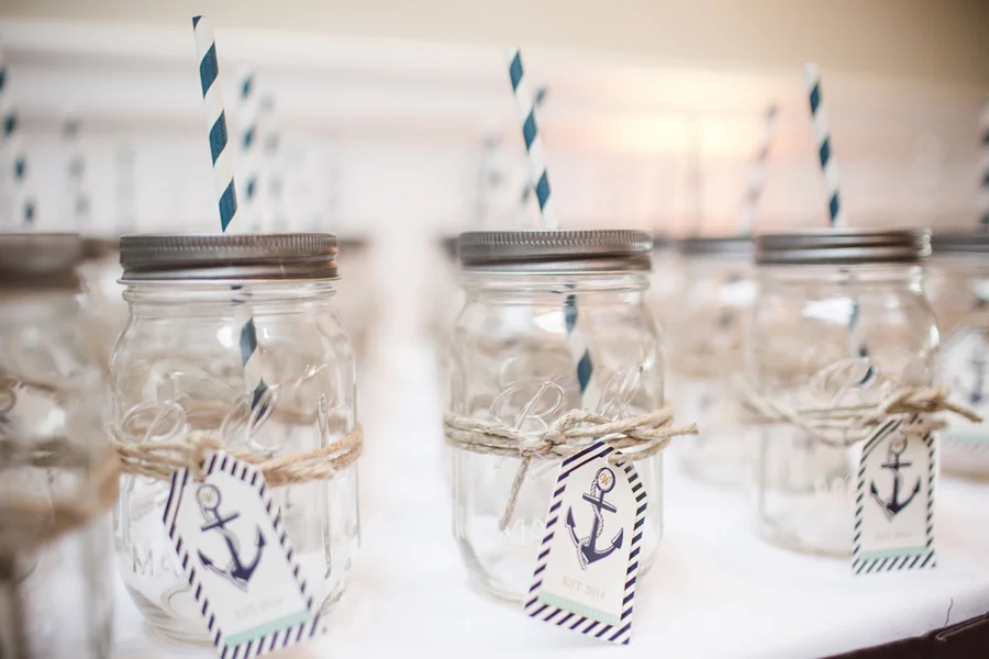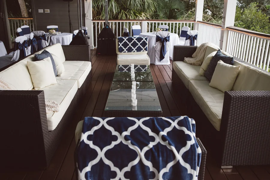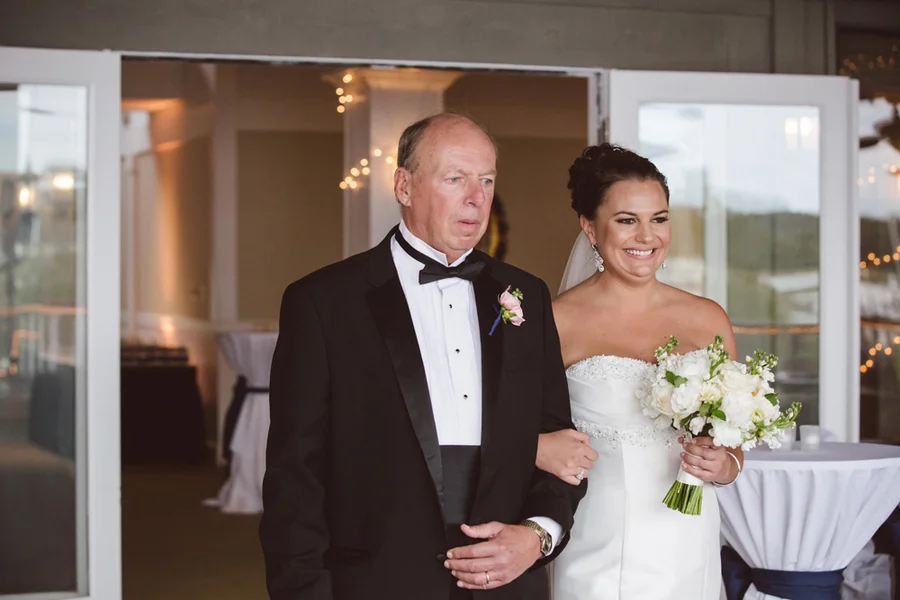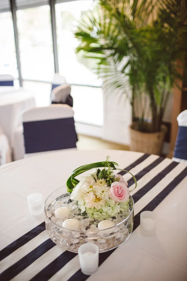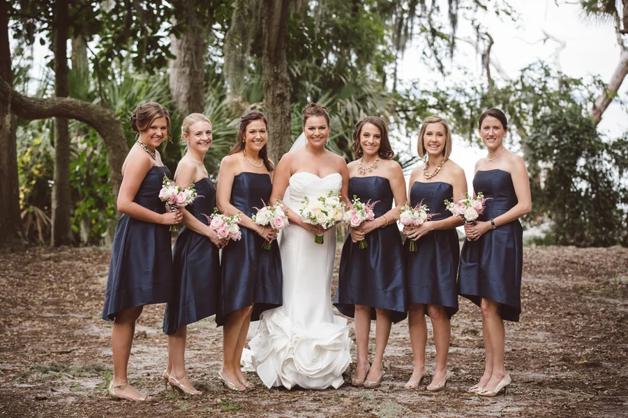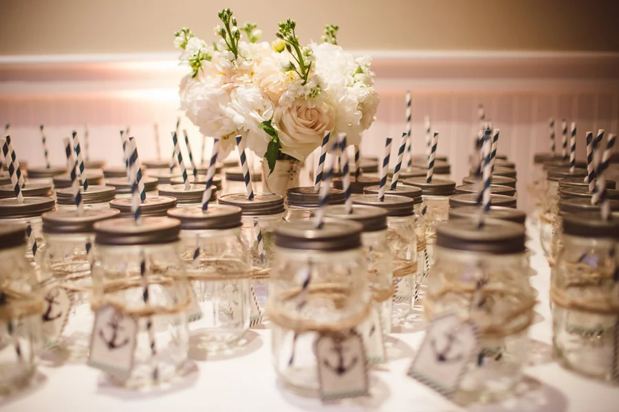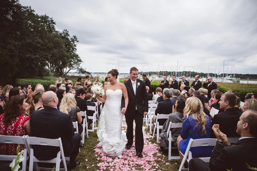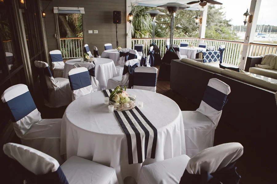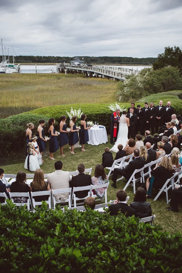 We've got a soft spot in our hearts for nautical-inspired wedding details, and who can blame us? The recognizable navy and white color palette lends a preppy vibe to any coastal soiree, especially when mixed with bold stripes...and Brooke + Greg did just that for their Hilton Head Island bash. The sweet couple met online and soon after found out they not only worked for the same company, but they also worked in the same building! Once they got engaged, they selected Hilton Head's Windows on the Waterway to host their November wedding. With the help of Jackie Brino of Celebrations Catering and Events, Brooke + Greg said 'I do' in a lovely outdoor ceremony overlooking the water. Jackie's bridesmaids wore navy dresses and carried bouquets of pale pink and white roses wrapped in a navy and white stripped ribbon from A Floral Affair while Brooke wore a stunning James Clifford gown. After, guests enjoyed Lowcountry cuisine from Celebrations Catering and Events, a cupcake tower from Kim’s Kreations and their very own mason jar! Thanks to amelia + dan photography for documenting their Windows on the Waterway wedding day!